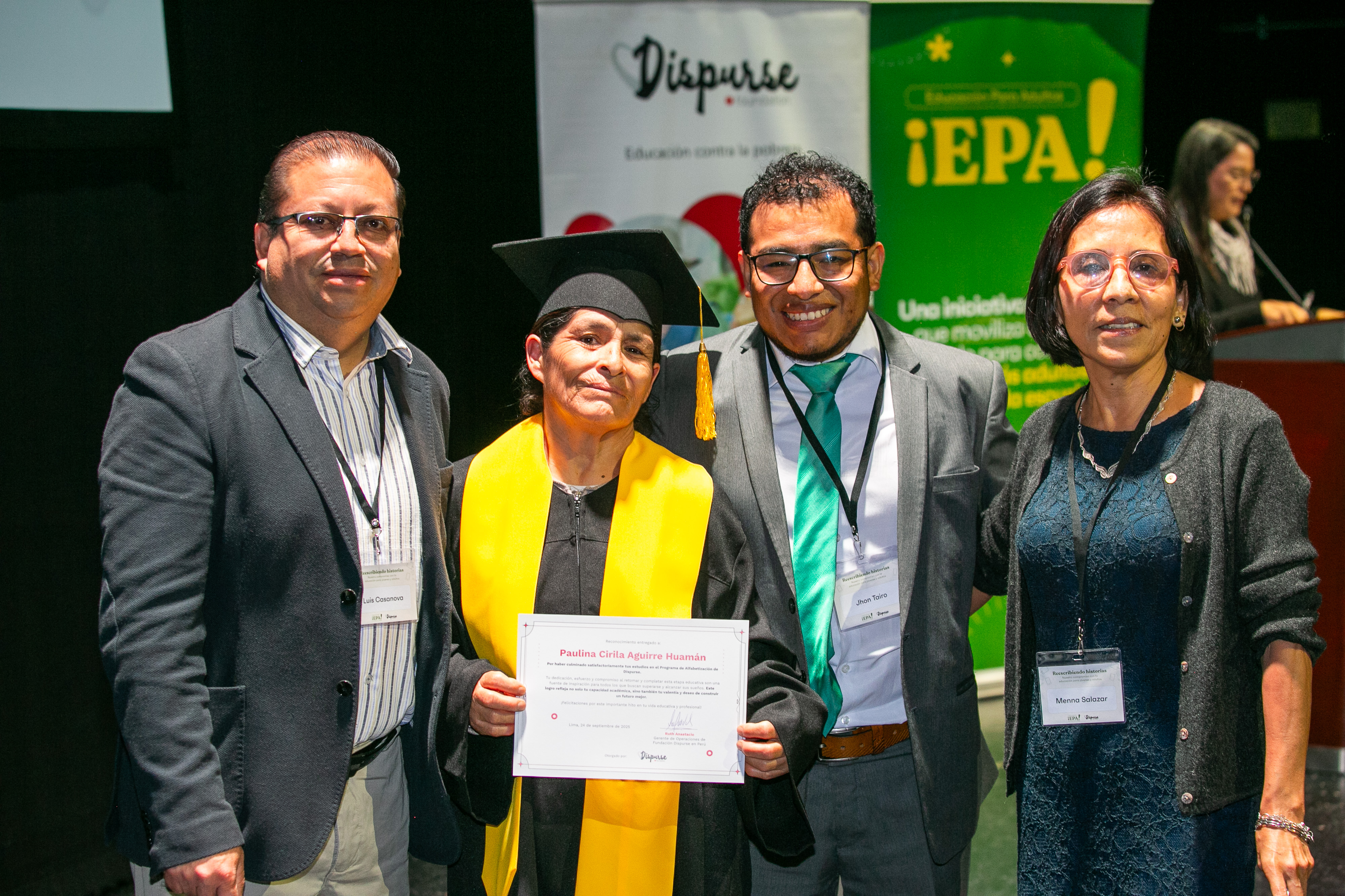 During the event, a symbolic graduation ceremony was held for 55 students from different regions of the country, recognizing their efforts to resume and complete their educational pathways. Of this group, 16 students are part of programs implemented by Dispurse Foundation in Cusco, Cajamarca, Pasco, Apurímac and Lima.